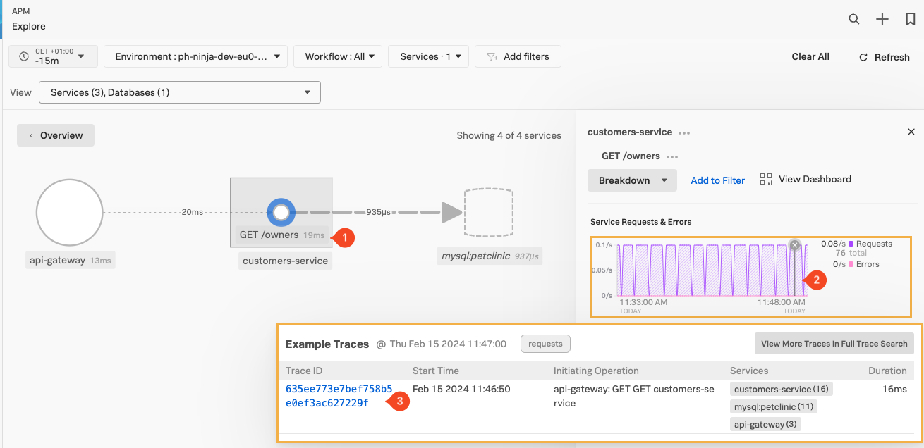 To pick a trace, select a line in the Service Requests & Errors chart (2), when the dot appears click to get a list of sample traces: