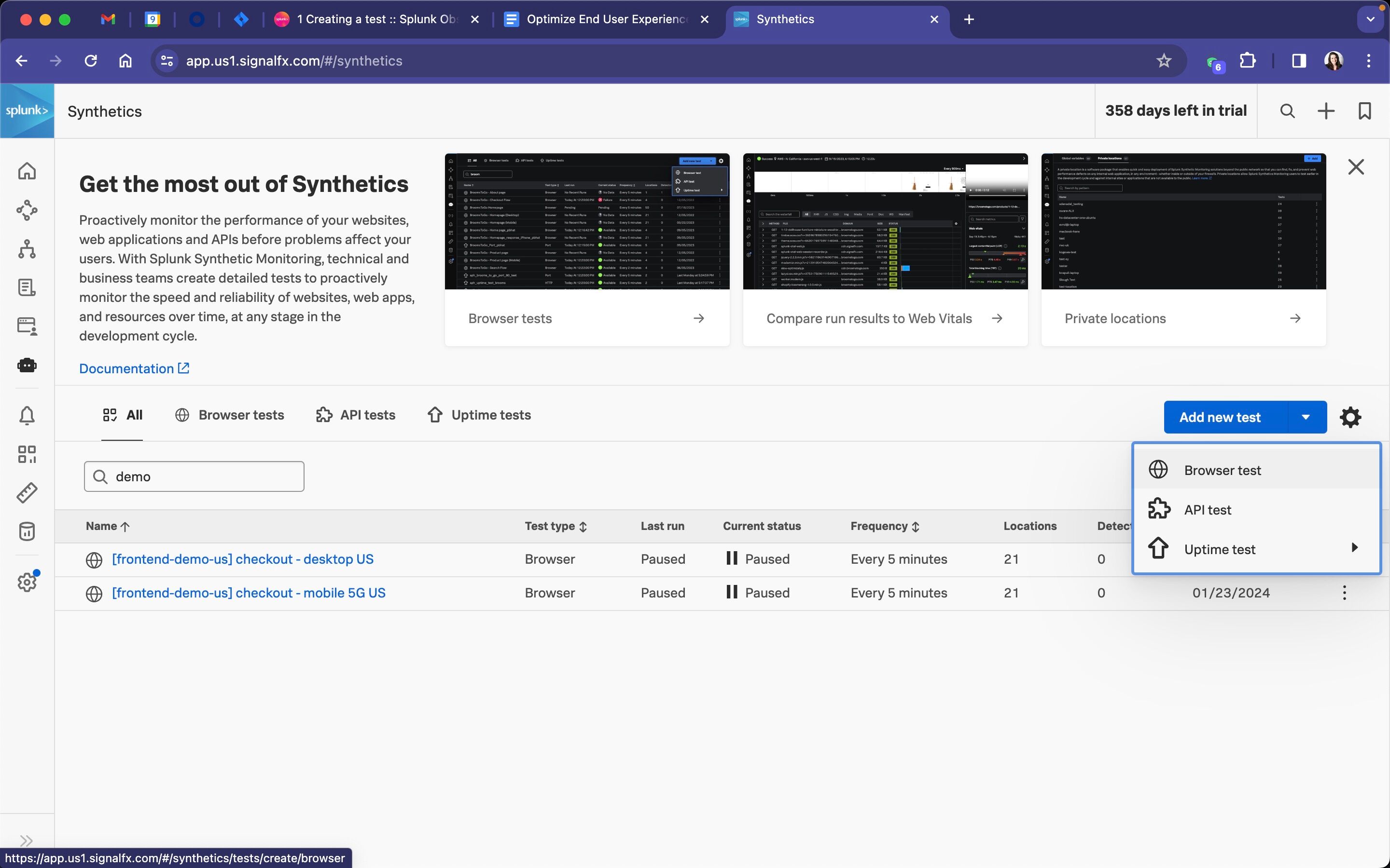Let’s quickly set up some tests in Synthetics to immediately start understanding our end user experience, without waiting for real users to interact with our app.