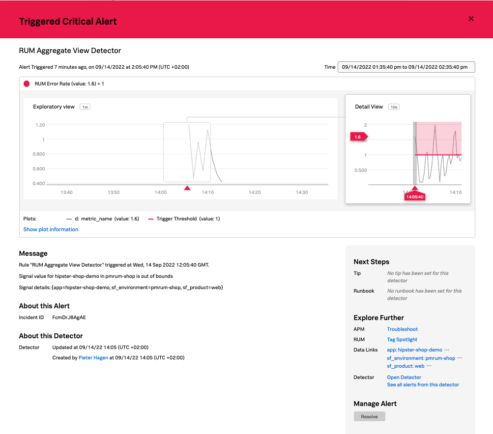 In the screen shot you can see we have a critical alert for the RUM Aggregated View Detector, and a Count, how often this alert has triggered in the selected time window. If you happen to have an alert listed, you can click on the name of the Alert (that is shown as a blue link) and you will be taken to the Alert Overview page showing the details of the alert (Note: this will move you away from the current page, Please use the Back option of your browser to return to the overview page).
