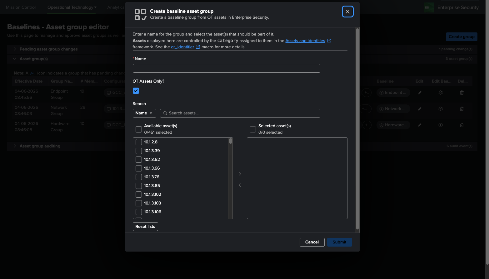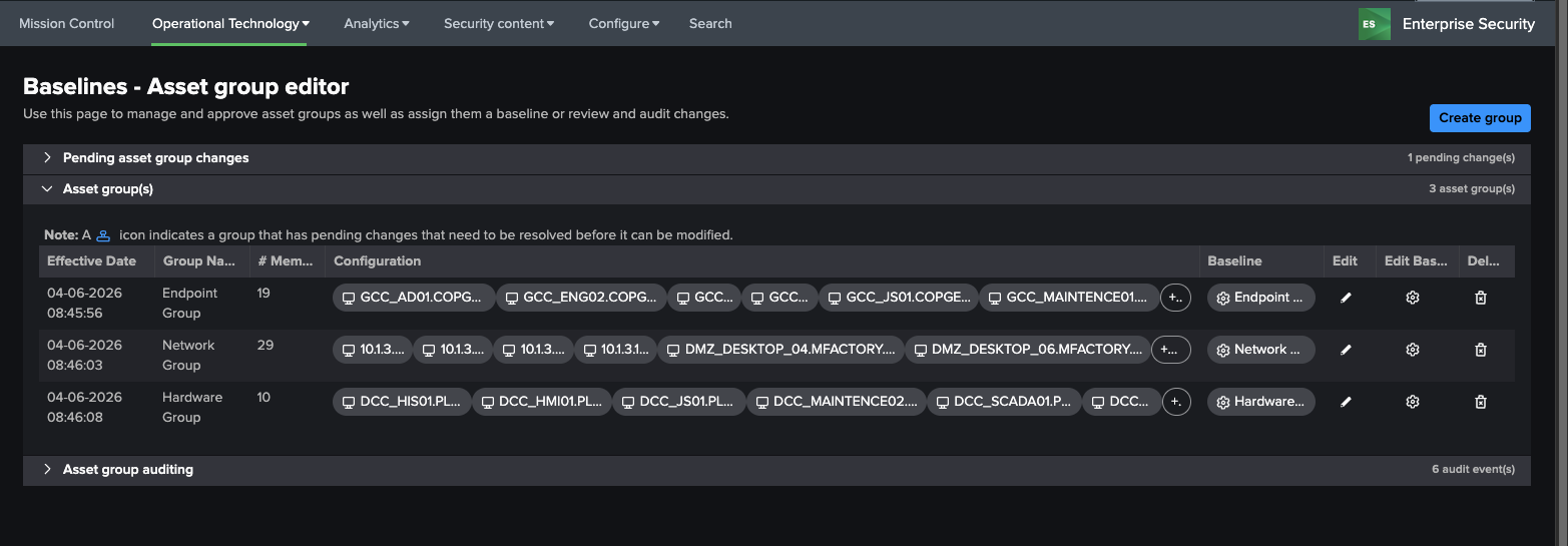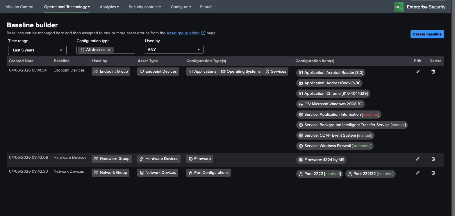 There are two components in the OT Security Add-on that allow baselines to be created, the asset group editor and the baseline editor. To use the baseline editor, groups must first be set up. Several configurations for baselines come included with the OT Security Add-on: