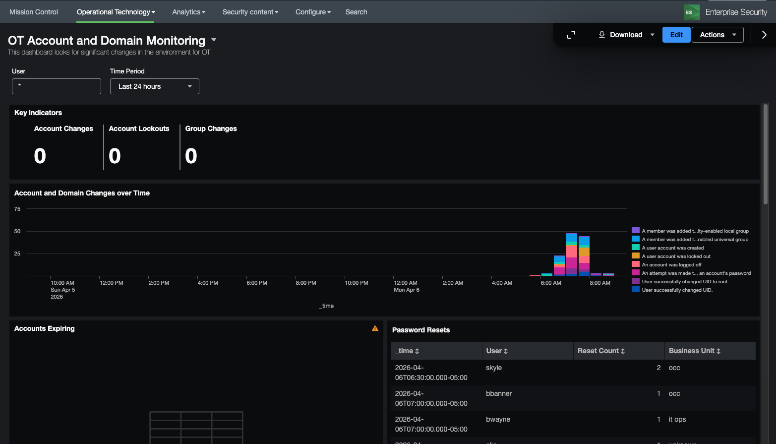 This dashboard focuses on monitoring account usage and changes as well as monitoring OT related domains. It provides information on invalid accounts, lockouts, password expiry, as well as information regarding group and other user account modifications.