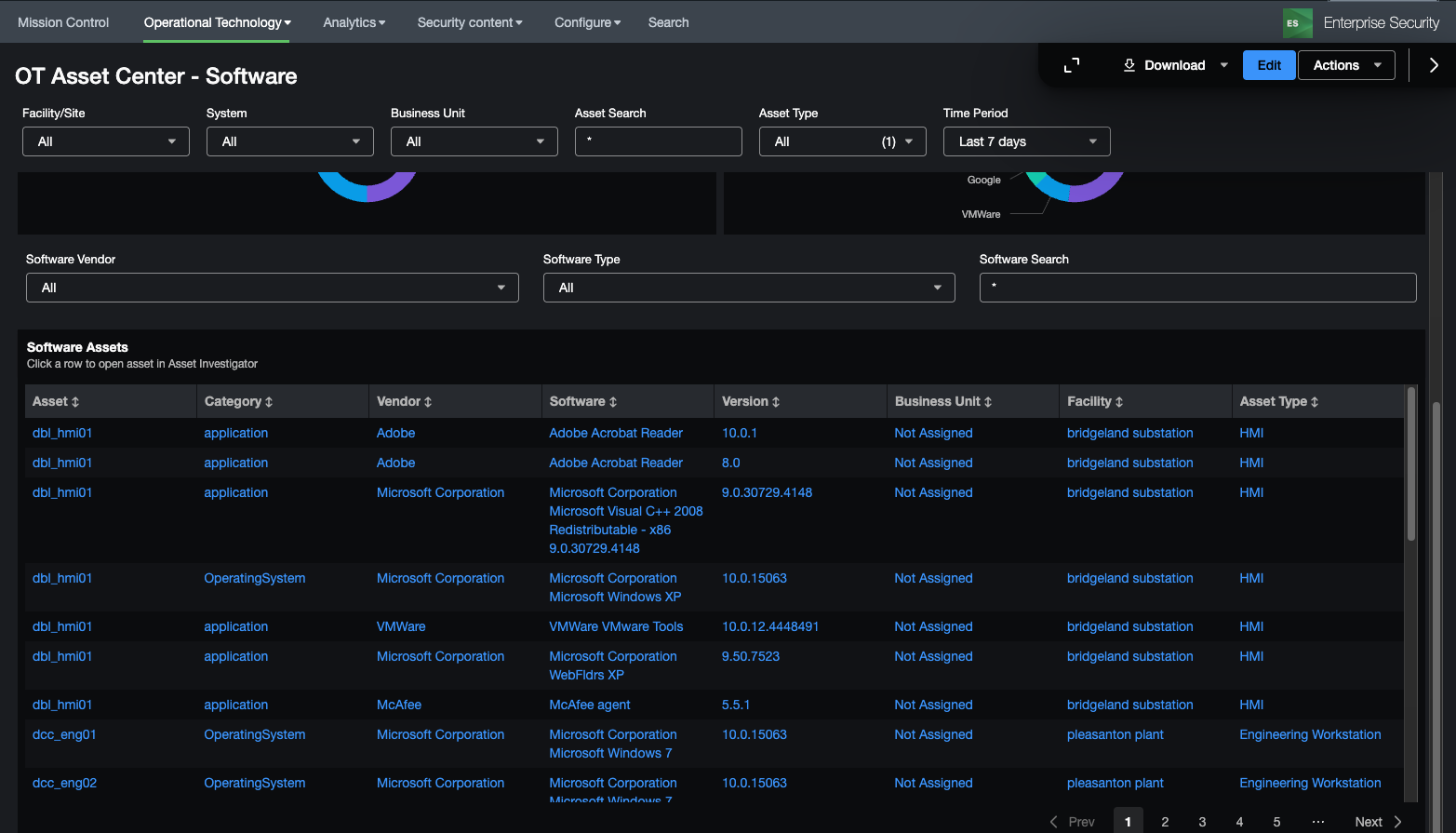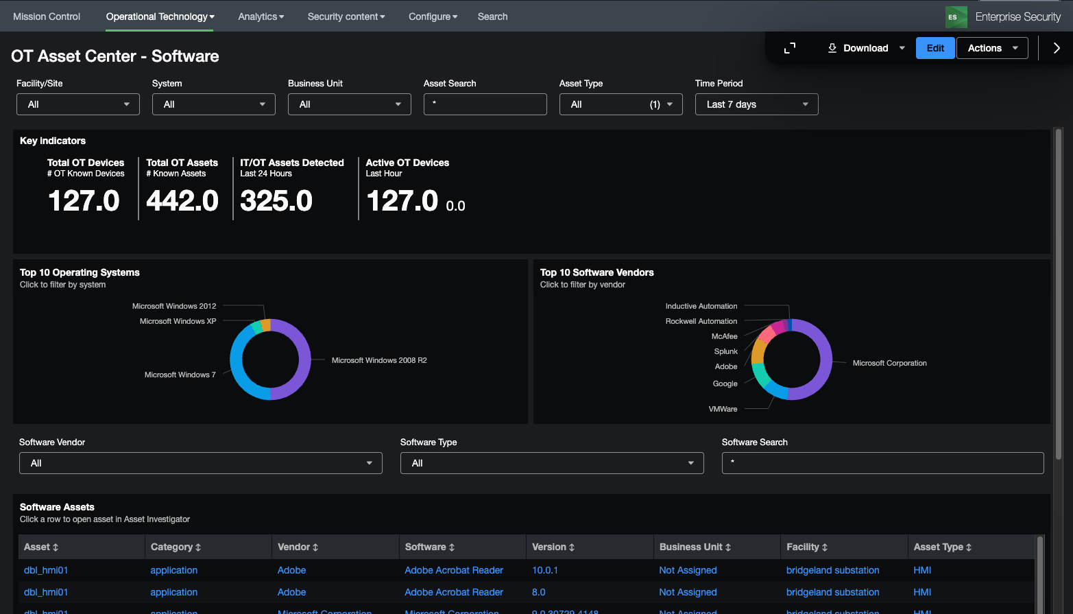 The OT Asset Center is designed to provide visibility into OT systems and provide meaningful metrics related to vendors, models, and asset types. Unlike the OT Asset Investigator, this dashboard focuses on the entire environment and not specific assets and allows users to search for specific software or hardware in the OT Environment.