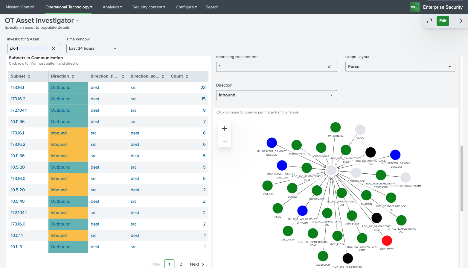 The OT Asset Behavior Indicators provide base metrics on the networking behavior of the selected asset and visualizes the types of communication with others hosts in the environment. This can prove important when trying to identify for example communication that should not be permitted between subnets. Subnets listed on the left can be clicked on to filter the network communication graph on the right-hand side.