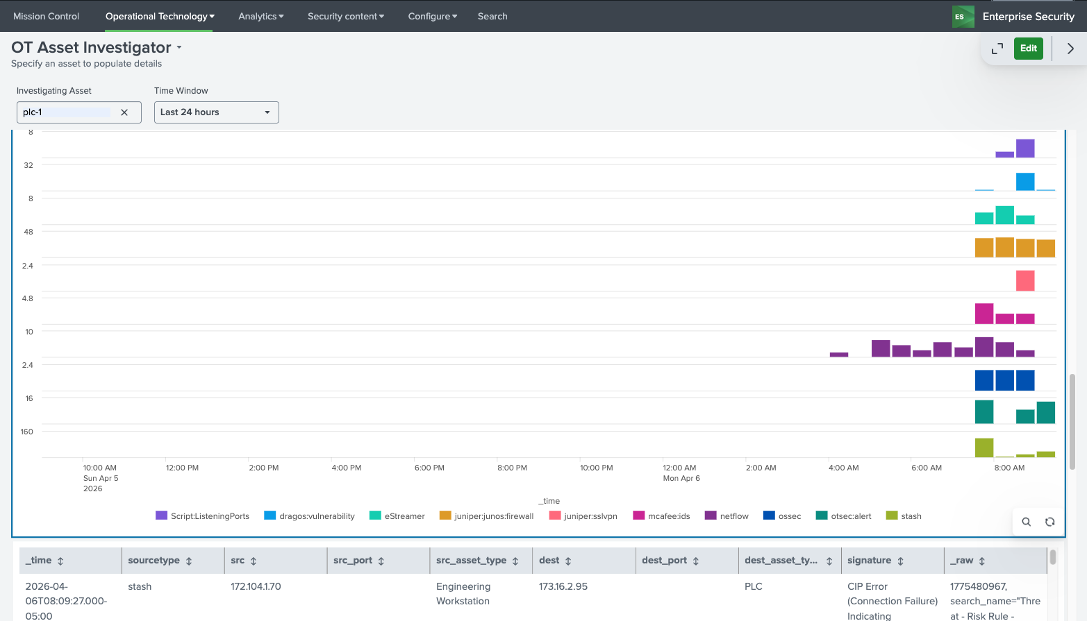 Sourcetype Timeline Drilldown Example (OT Asset Investigator):
