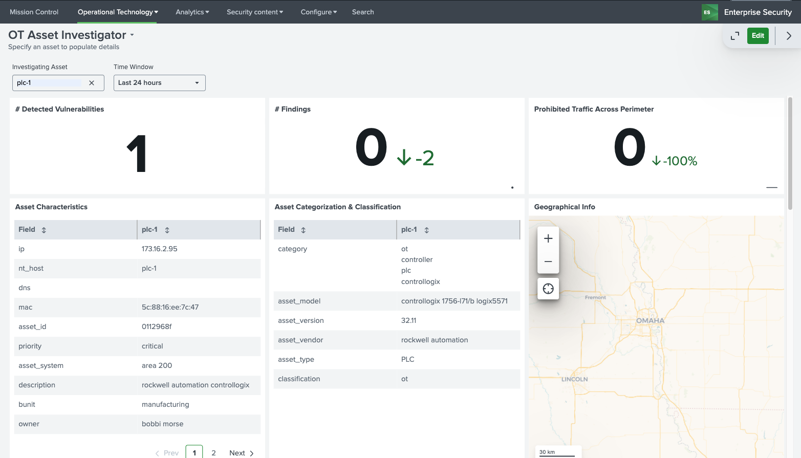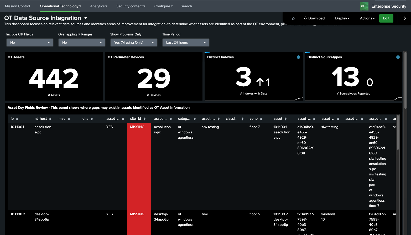 While Splunk Enterprise Security provides existing dashboards and capabilities around understanding Assets, OT systems often require additional context and investigation before action is possible. Splunk for OT Security extends Splunk Enterprise Security's Asset & Identity Framework to include additional important fields such as site, role of machines, and location within ISA 99 models.