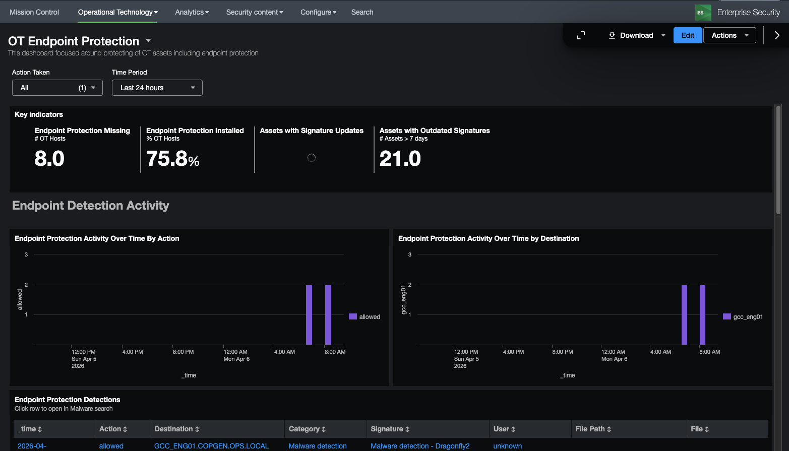 This dashboard is focused on monitoring of endpoint protection products and ensuring that endpoints are adqueately protected. While many OT vendors do allow endpoint protection like antivirus, there are can be gaps in understanding how protected an entity might be. This dashboard is meant to provide information such as the kinds of endpoint protection activity occur, detections, as well as endpoints with no protection, outdated signatures, and last updates.