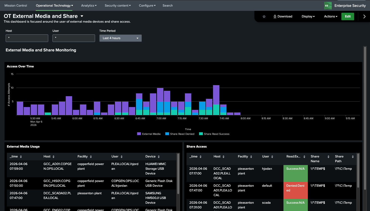 This dashboard is designed to show the use of external media devices on OT Assets as well as File Shares. Both are known ways to bypass security controls or exploit hosts. It includes both successful and failed share access attempts and usage of external media devices over time.