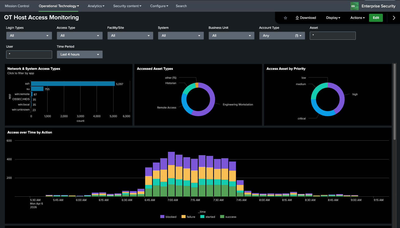 This dashboard is designed to show access by users to hosts in the OT environment. This includes both remote, local, and physical access to assets (across workstations, servers, databases, networking equipment, etc). This includes both successful as well as failed logins
