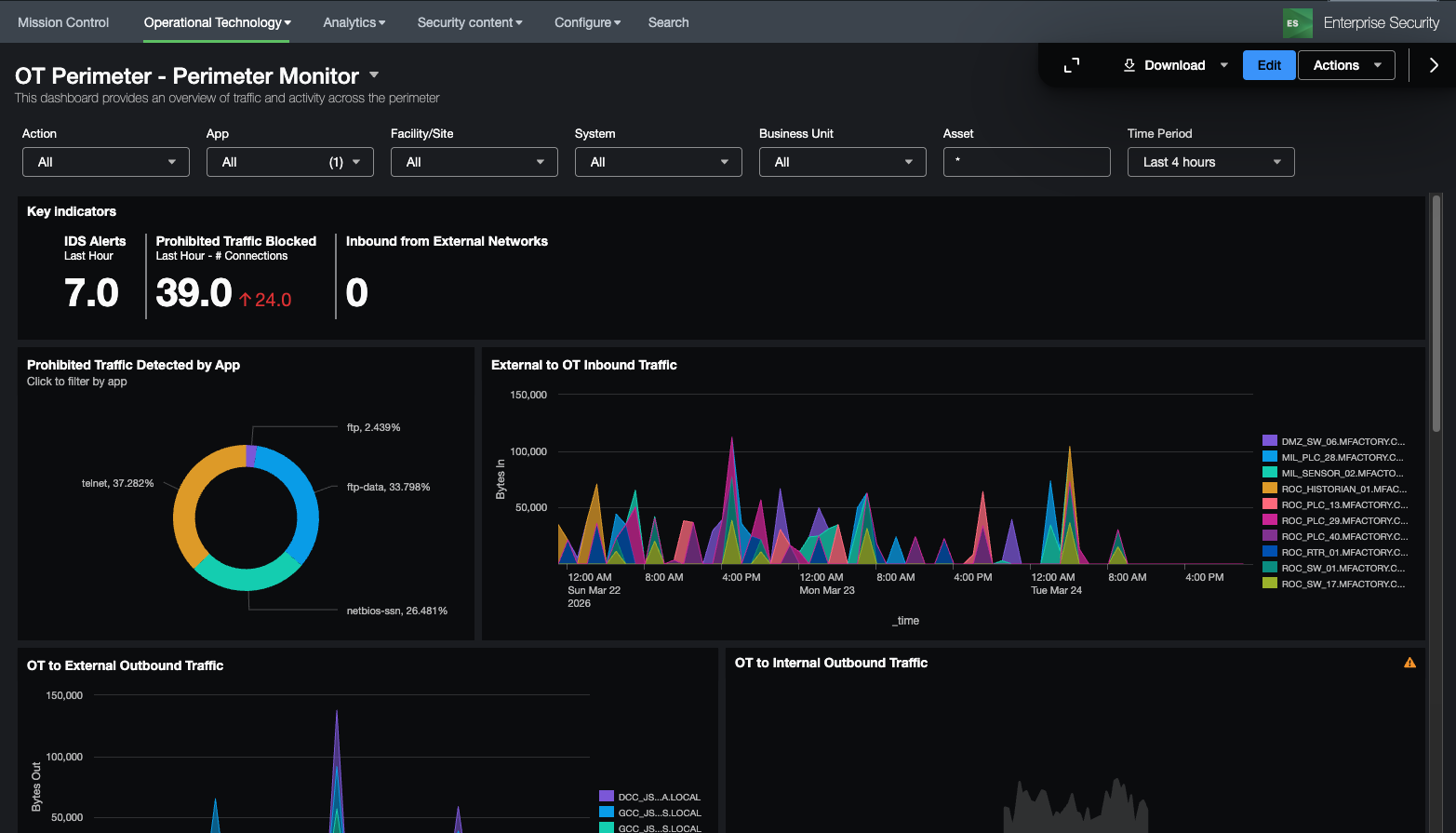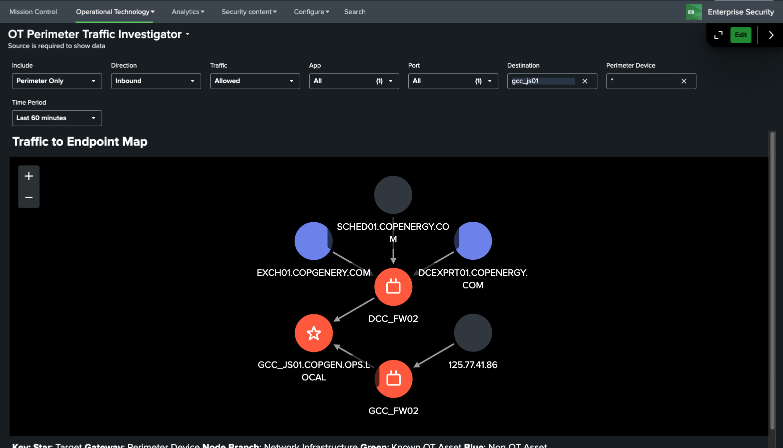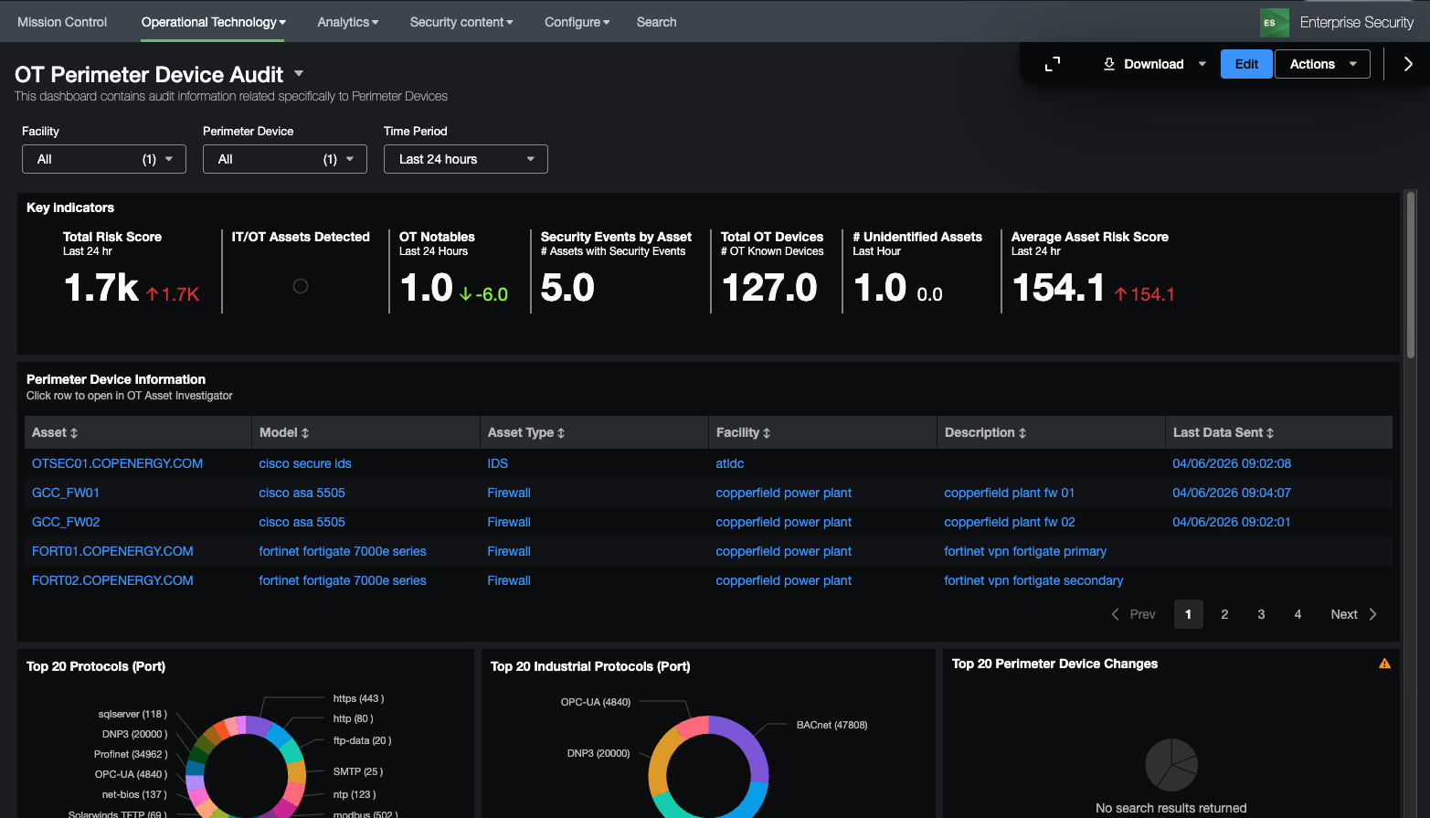This dashboard focused on changes that have been made to devices identified as perimeter devices as defined in the get_perimeter_devices macro. It provides some KSI's on those device changes as well as an overview of the perimeter devices, ports and protocols being used by those devices, access to perimeter devices, and audit logs of both firewall rule changes as well as the rules themselves. It can be useful for identifying what changes are made on devices as well as who is logging into perimeter devices. Firewall rules and object definitions are contained in the ot_firewall_rules and ot_firewall_object_groups lookup files.
