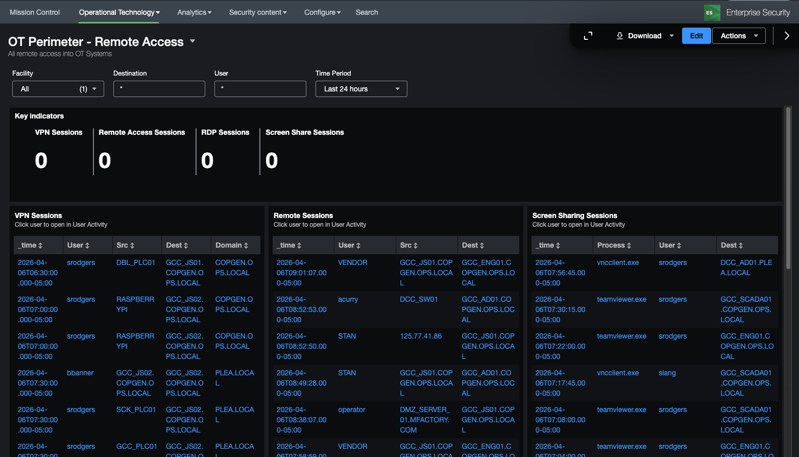 This dashboard is focused on remote access into an OT environment, specifically VPN, RDP, Screen Sharing Sessions, or other remote access. It provides KSI\'s related to this activity as well as specifics on the remote access activity. It also provides a visual diagram showing the access path to assets by users visually to identify prohibited access (for instance if all remote access should come via a remote access or jump server).