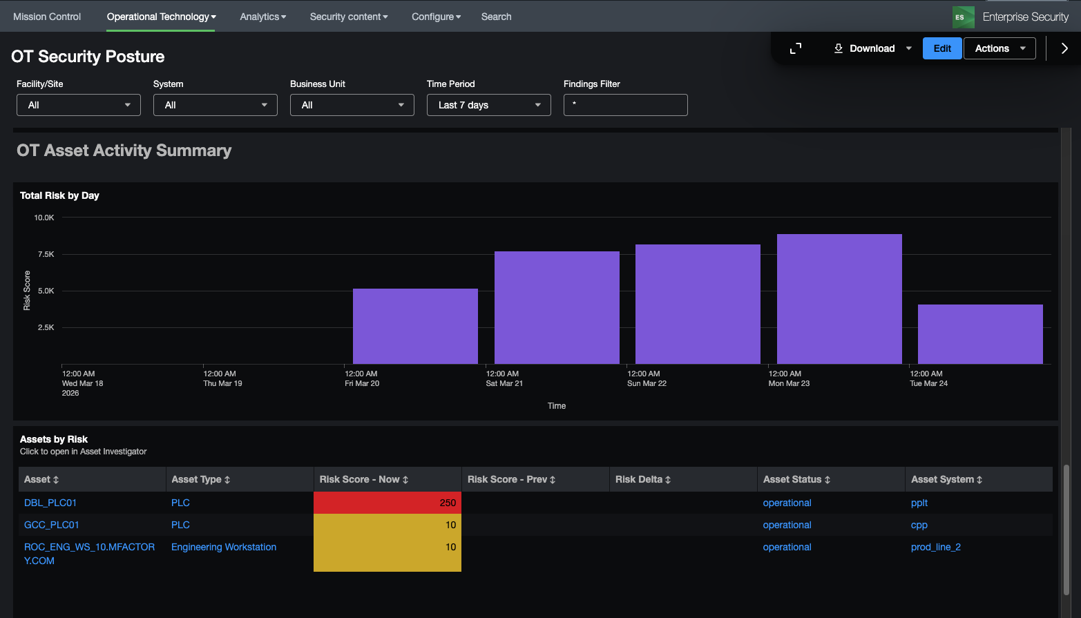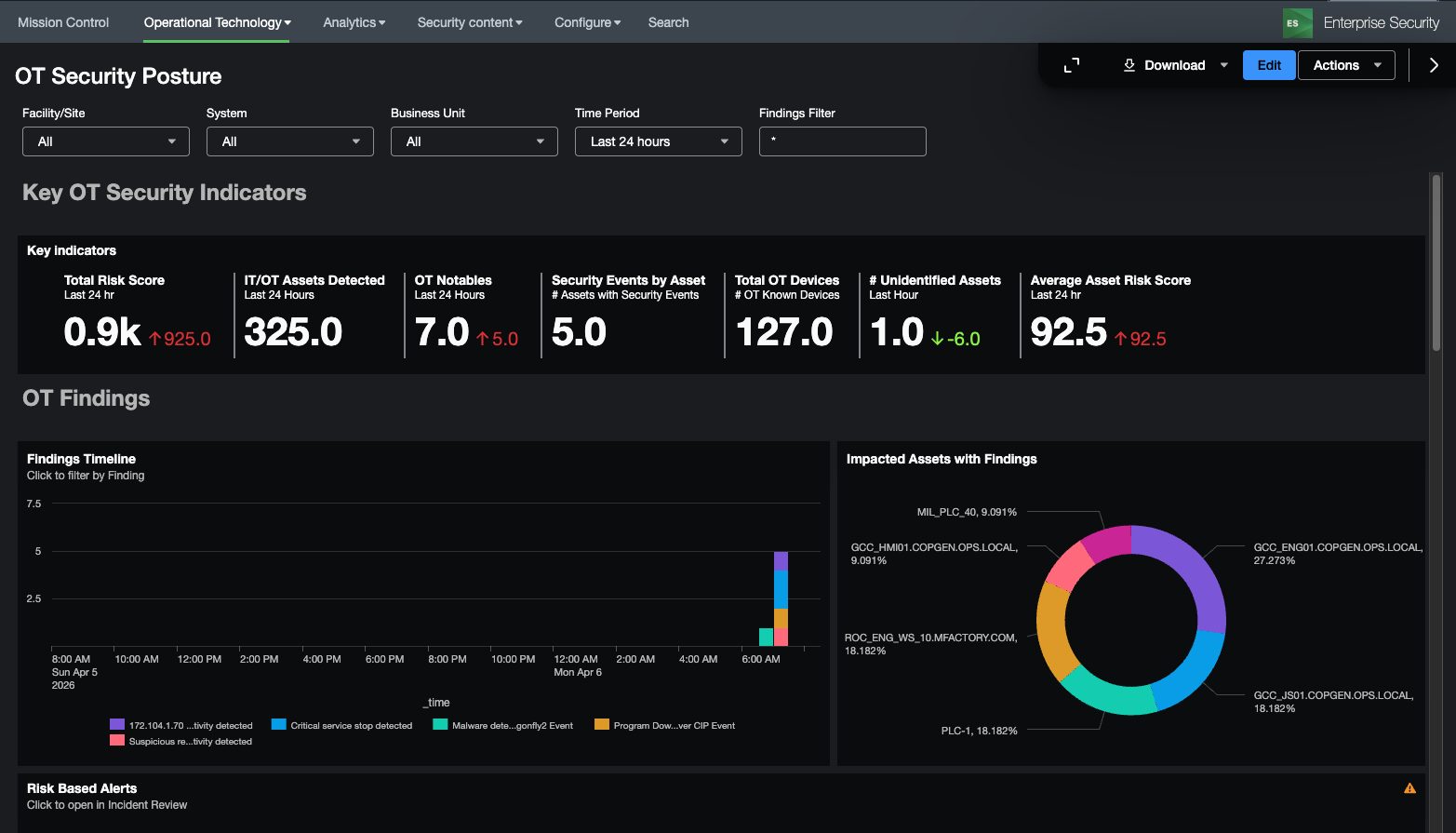 While in most cases Splunk for OT Security will be integrated in a combined Security Operations Center for both IT and OT, specific views into the OT environment can help an analyst understand current security posture. This includes specific views around security posture, OT assets, as well as vulnerabilities in OT Environments. In addition, OT assets are now integrated directly with Splunk Enterprise Security existing dashboards, reports, and incident management capabilities.