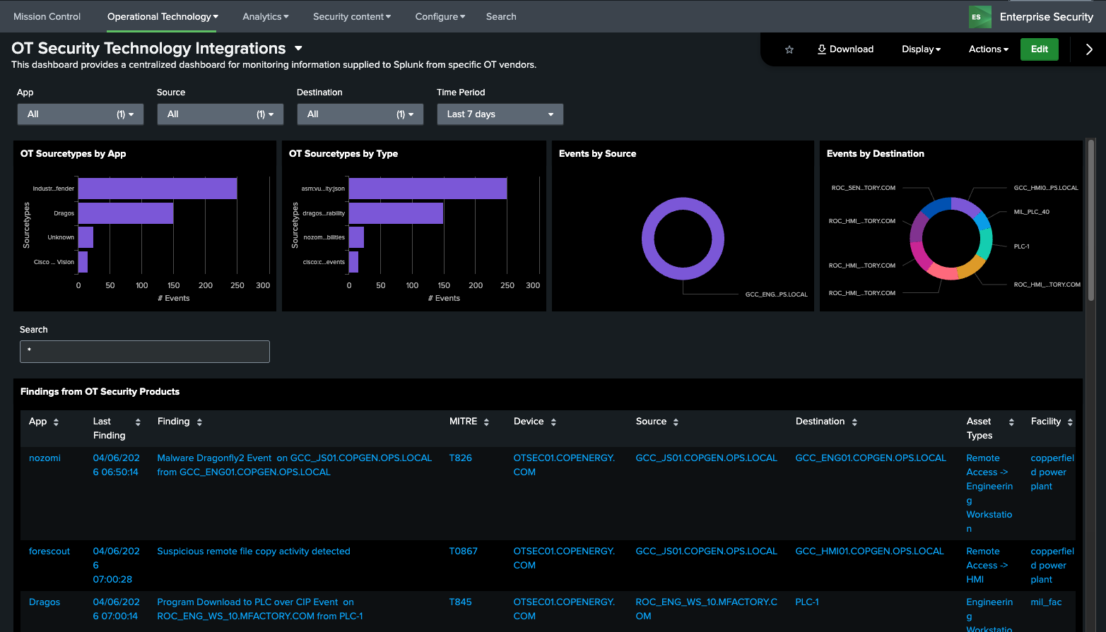 The OT Security Dashboard is intended to bring together diverse OT Security tools into a single dashboard and provide a way to search across these different technologies. In the dashboard a user can search and filter across different sourcetypes associated with these products. This dashboard leverages the macros get_ot_security_events and get_ot_security_notables to specify which products should be presented in this dashboard.