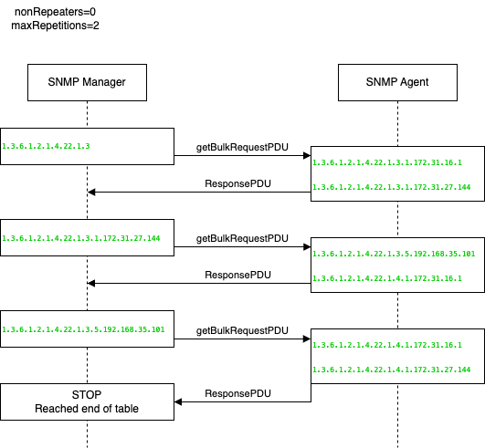 It can be spotted on diagram that response for IP-MIB.ipNetToMediaNetAddress includes 2 oids as maxRepetition was set to 2.